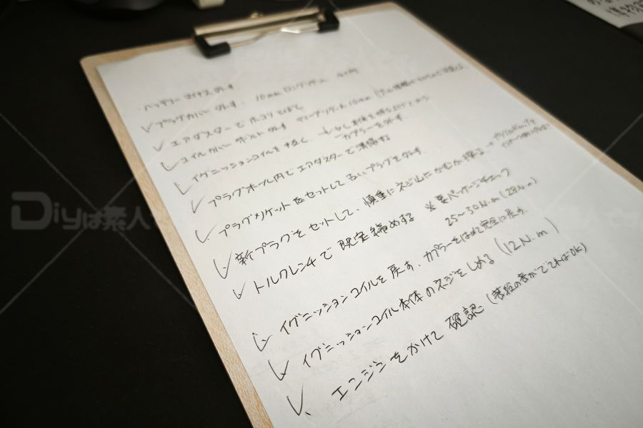 筆者にとっては初めての作業だったので、慎重を期す意味も含め「手順をすべて記入したクリップボード」を見ながら順番に作業していくことにした。作業の漏れが防げるので不安な方はマネしてみて欲しい。