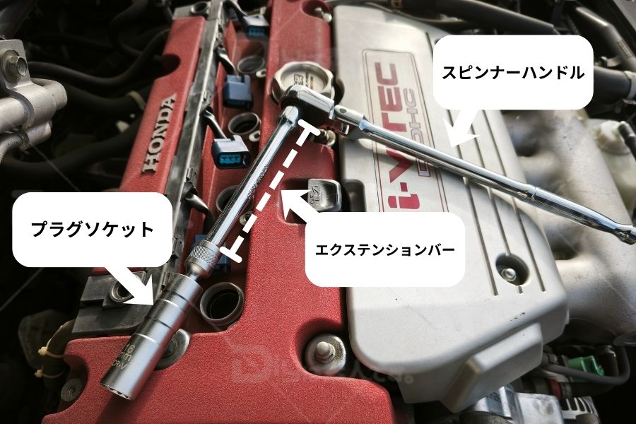 エンジンの種類にもよるだろうが、プラグ本体はエンジンヘッドカバー内の奥まったところにあるため、写真のようにプラグソケット→エクステンションバー→スピンナーハンドルと長さを延長しないとプラグ自体に届かないのだ。